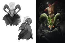 Concept art and creature design is something that has been fascinating me since I started drawing. This is Zyjukk, a demon that is covered in illness and death. He carries lost souls from the living and keeps them around his body. I can imagine him very well in games, e.g. as one of the «Darksouls» bosses.